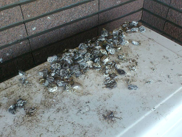 営巣場所や、鳥自身には寄生虫やウィルス細菌に汚染され危険を伴うので殺菌殺虫剤による散布処理にて安全な環境に戻します。